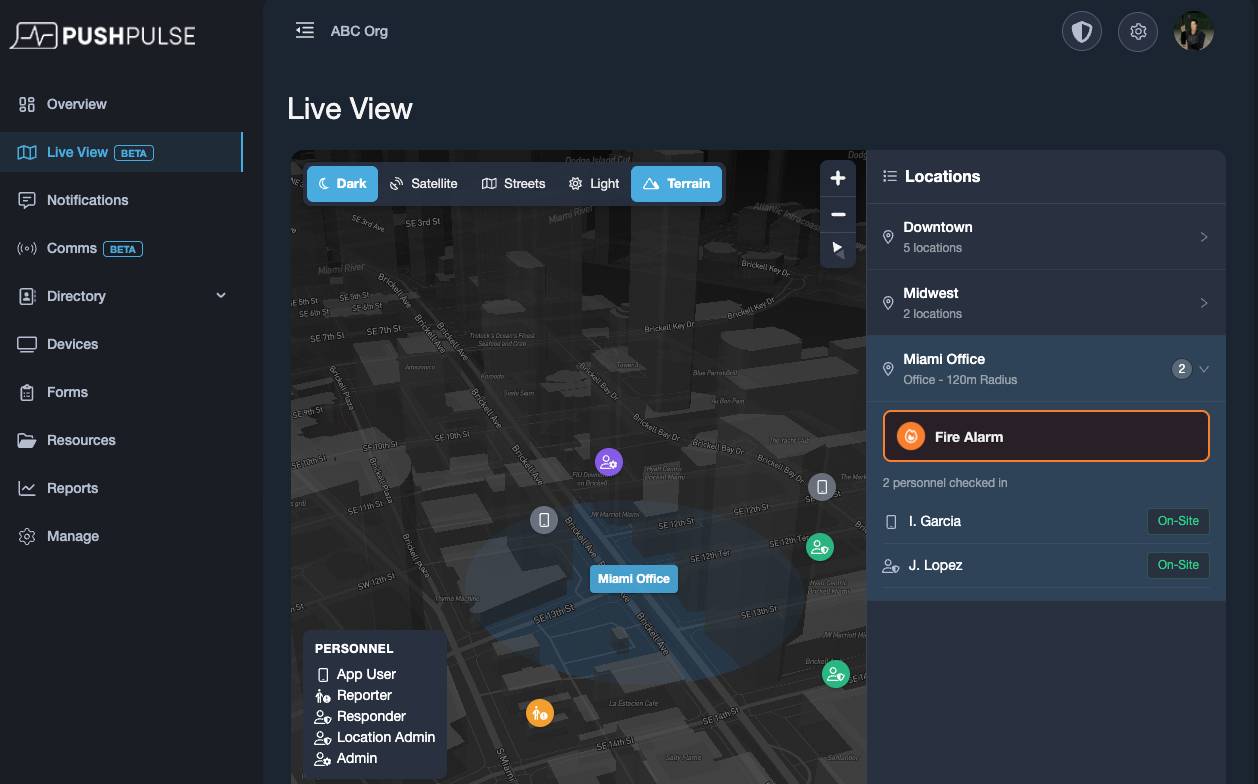 Live View gives your team a real-time operational snapshot across all locations, helping you quickly see what’s happening at a glance. From one centralized view, you can monitor locations, identify active incidents, and see which users are currently checked in, making it easier to stay informed during both routine operations and urgent situations. As Live View continues to evolve, future updates will expand visibility even further with floor plans and live location tracking.