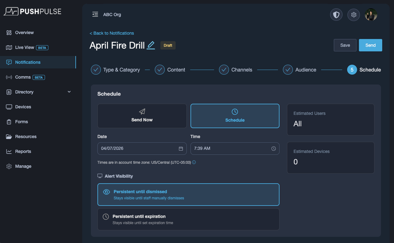 Scheduled Send gives you the ability to plan alerts ahead of time and have them delivered automatically at the exact date and time you choose. Whether you’re sending routine reminders, coordinating planned communications, or preparing for scheduled drills, this feature makes it easy to stay proactive without needing to manually send the alert in the moment.