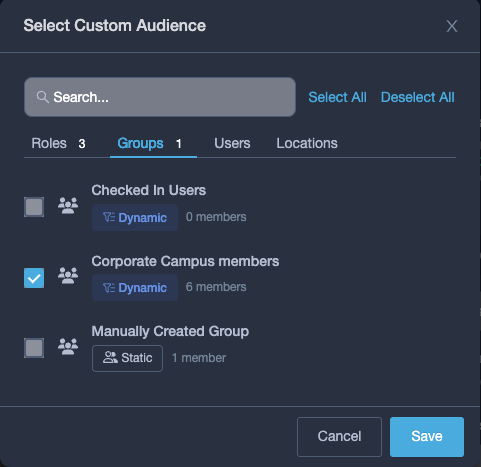 Dynamic Groups make it easier to manage your audiences by automatically updating group membership based on the criteria you define. Instead of maintaining static lists by hand, you can build groups using filters like checked-in status, location membership, role, and more—so your audiences stay current as conditions change.